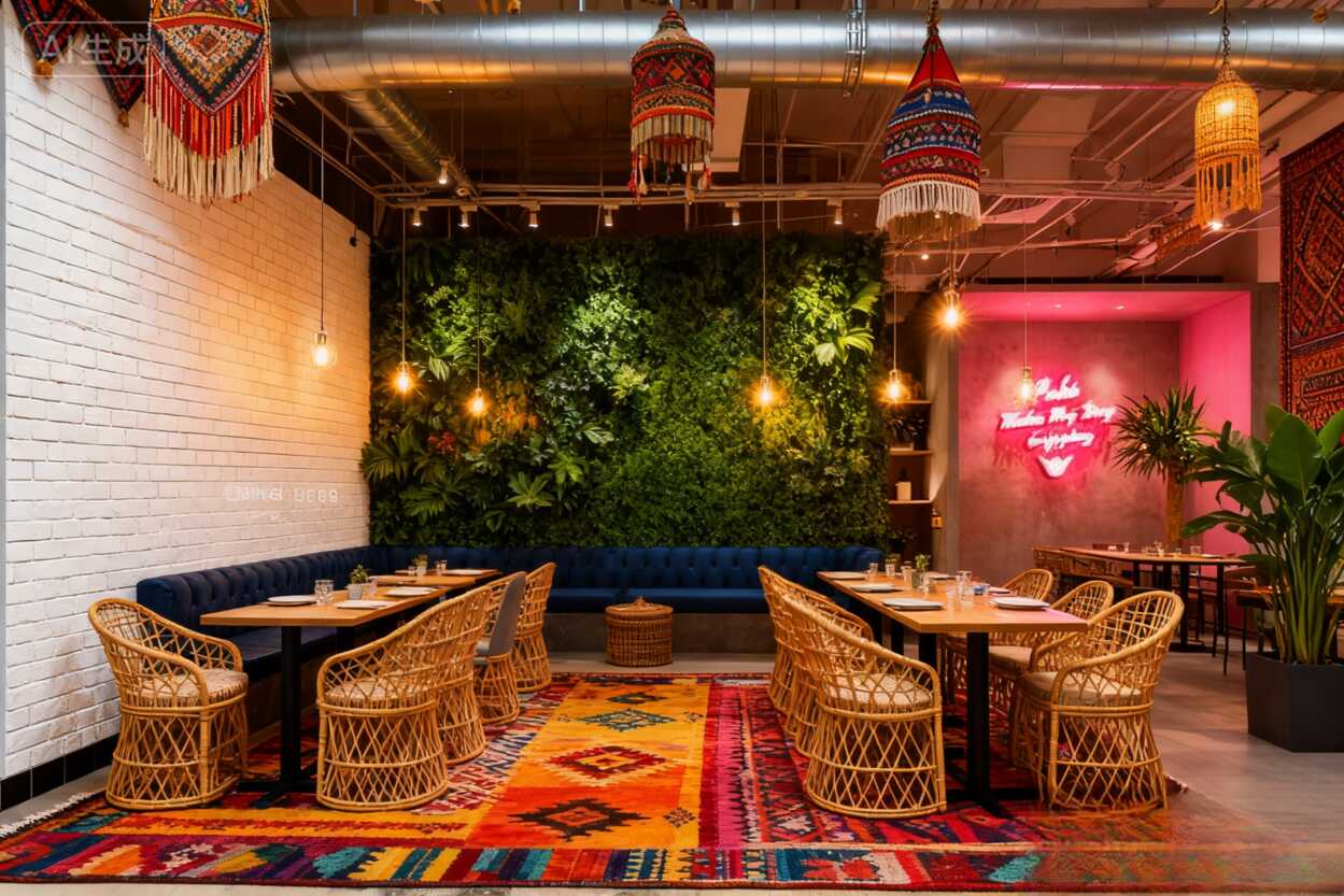 絕了!民族風地毯+霓虹招牌,這家餐廳軟裝...